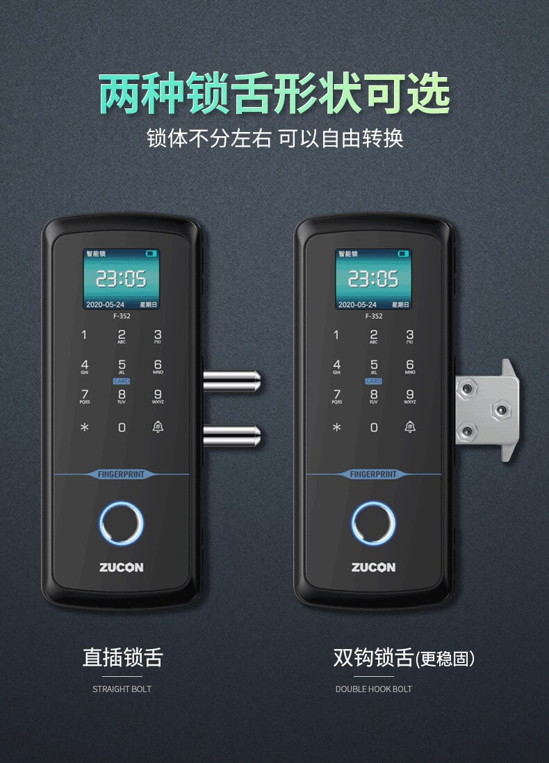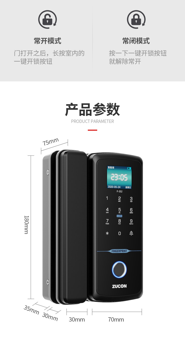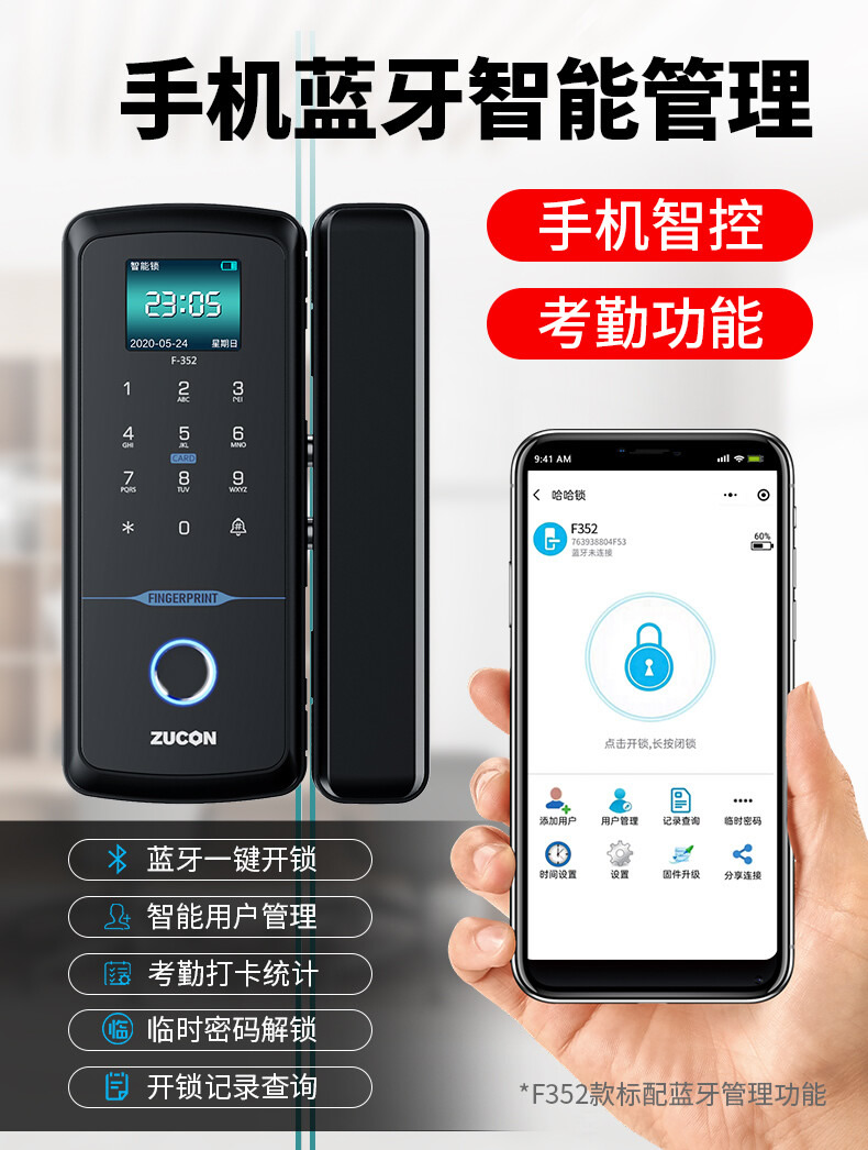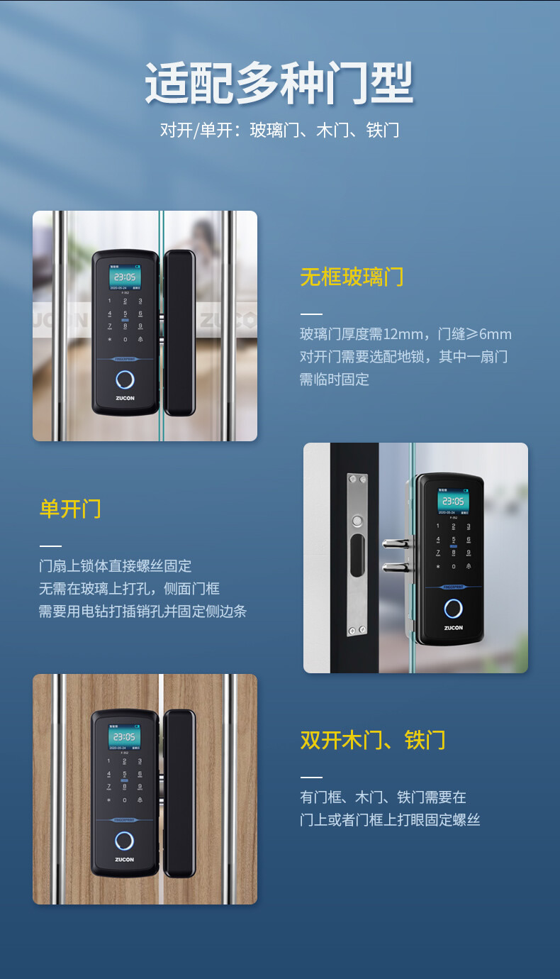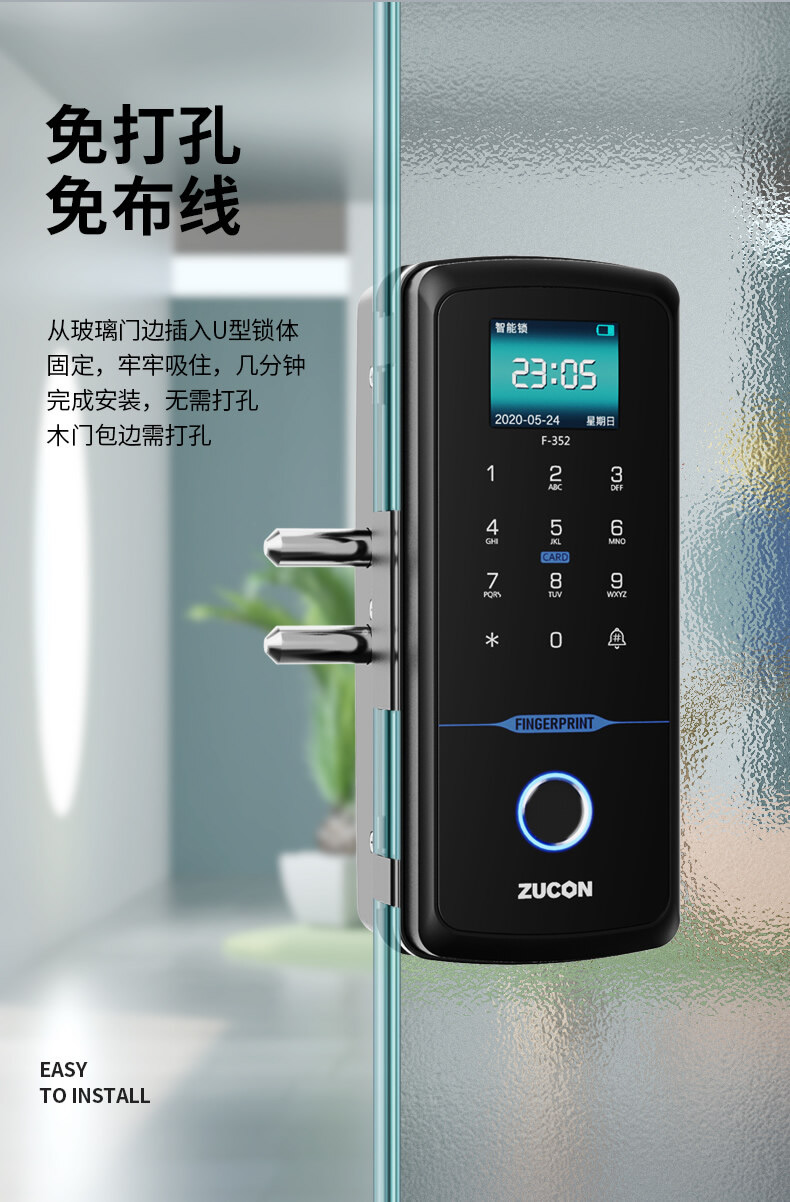 ZUCON祖程F352WIFI玻璃門指紋鎖免開孔辦公室智能電子密碼鎖單雙開門門禁鎖
