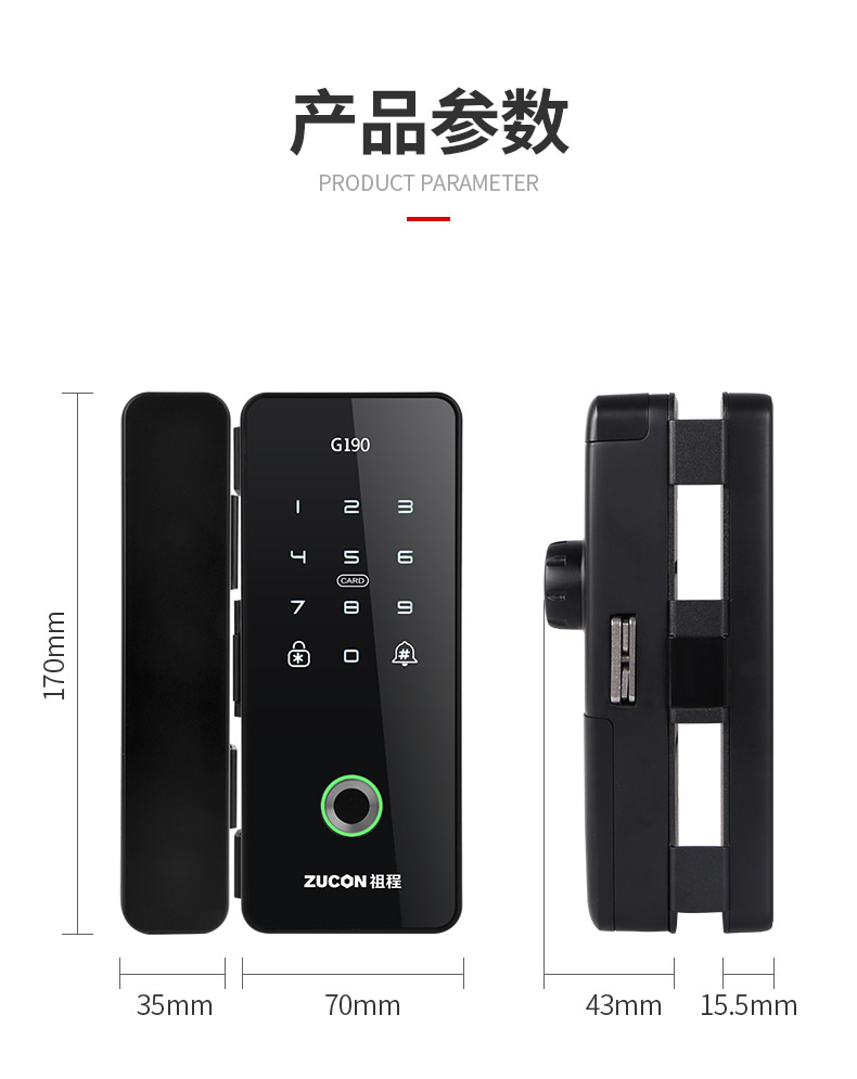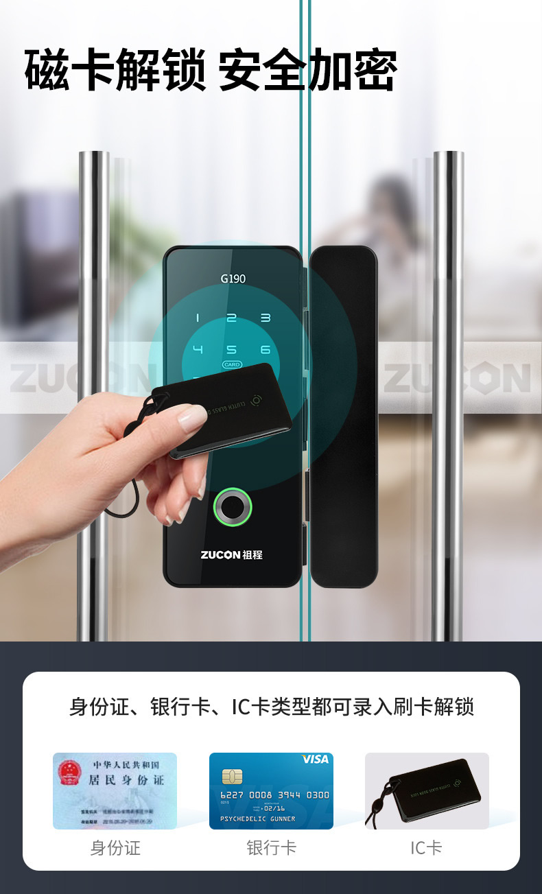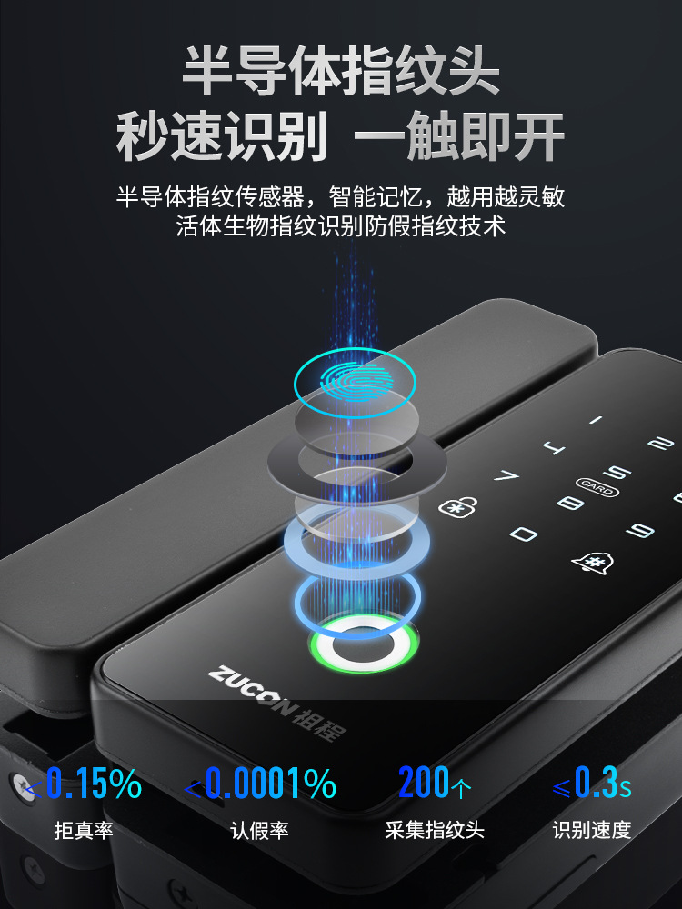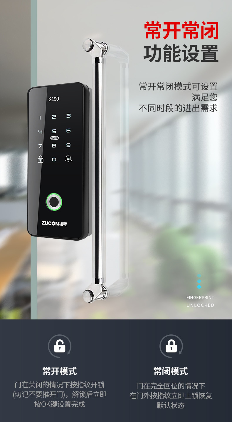 ZUCON祖程G190玻璃門指紋鎖辦公室密碼鎖免開孔單雙門鎖智能電子鎖門禁鎖