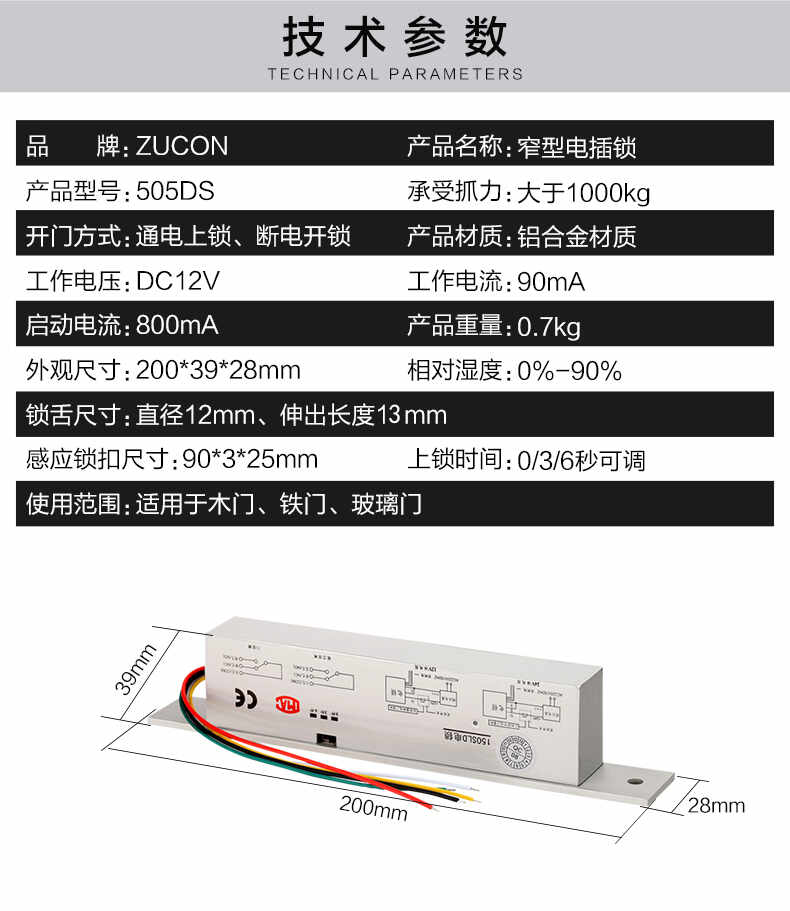 ZUCON祖程505DS門禁電插鎖窄型電插鎖門禁配套電插鎖耐用低溫電鎖