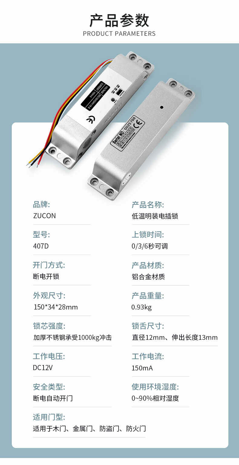 ZUCON祖程407D明裝電插鎖木門鐵門插銷鎖有框玻璃門禁系統斷電開