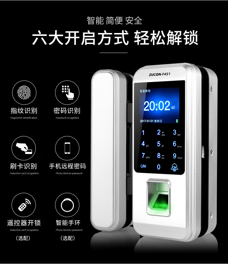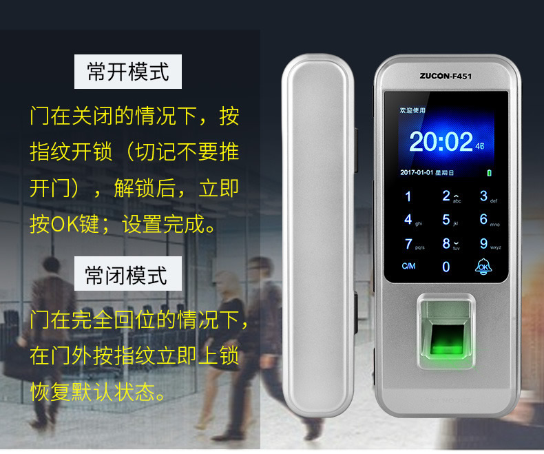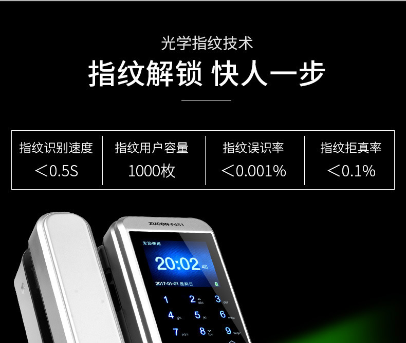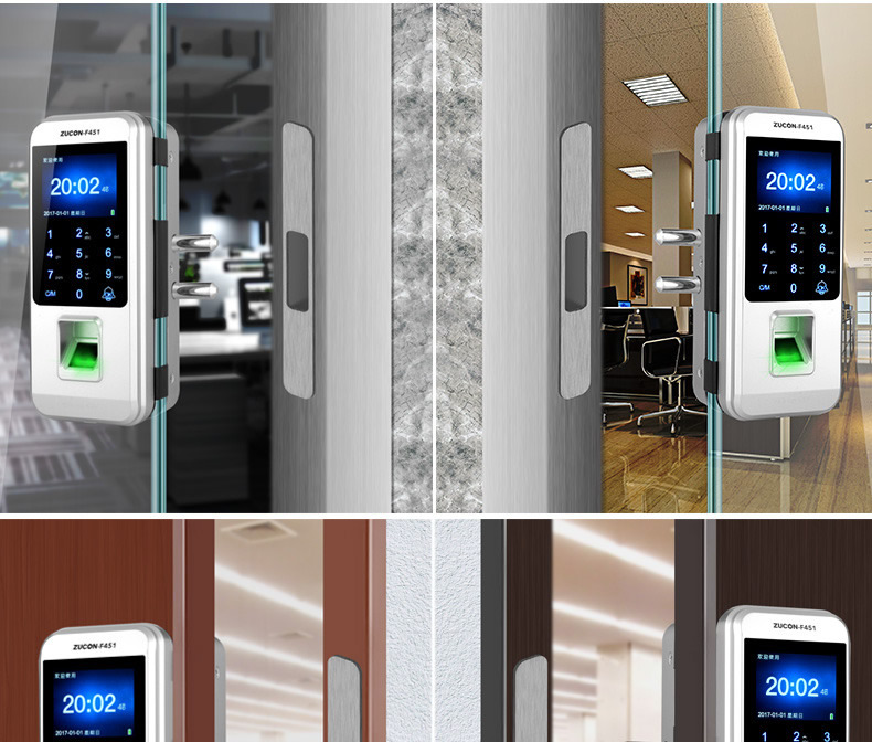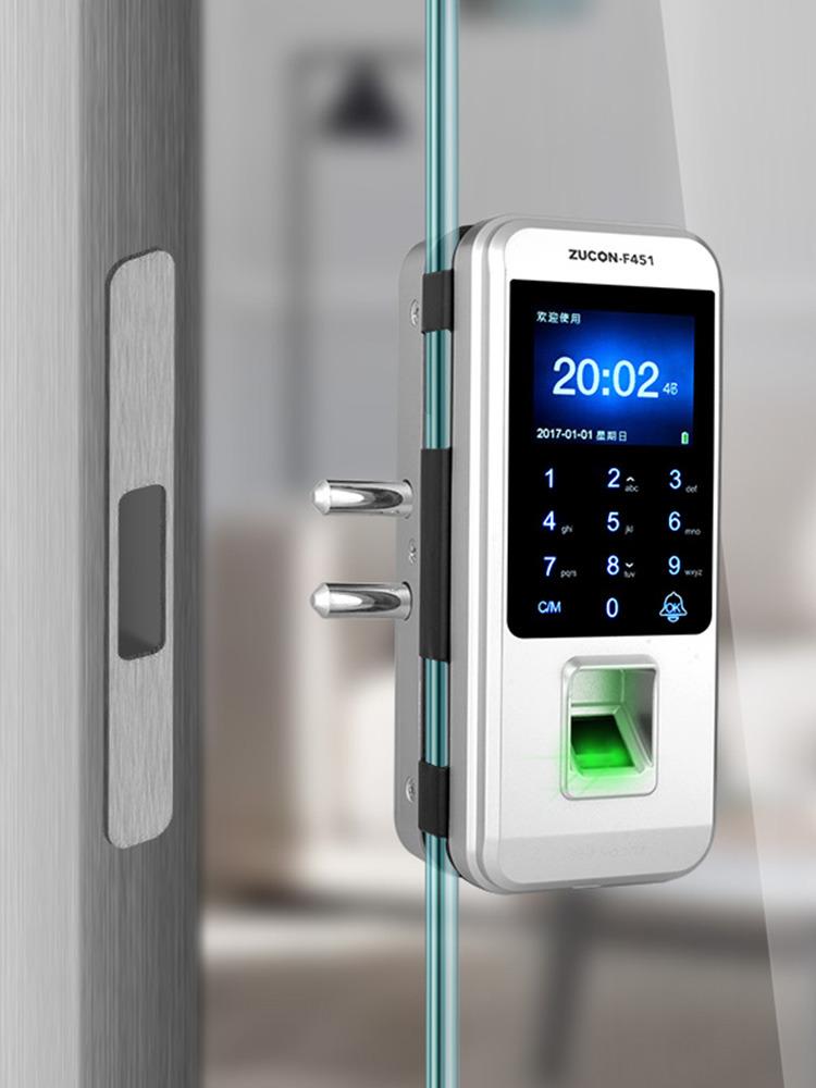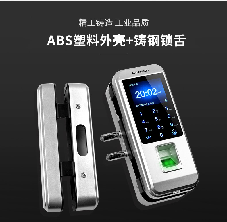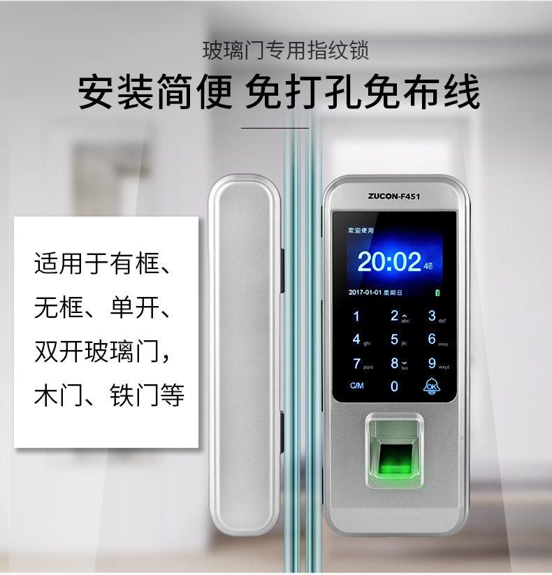 ZUCON祖程F451玻璃門指紋鎖免開孔雙門辦公室考勤電子智能門鎖密碼鎖
