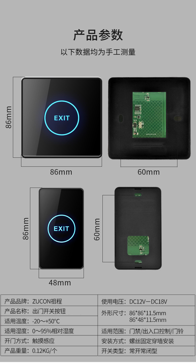 ZUCON祖程K81無線觸摸開關門禁系統(tǒng)觸摸出門按鈕電池免布線出門開關