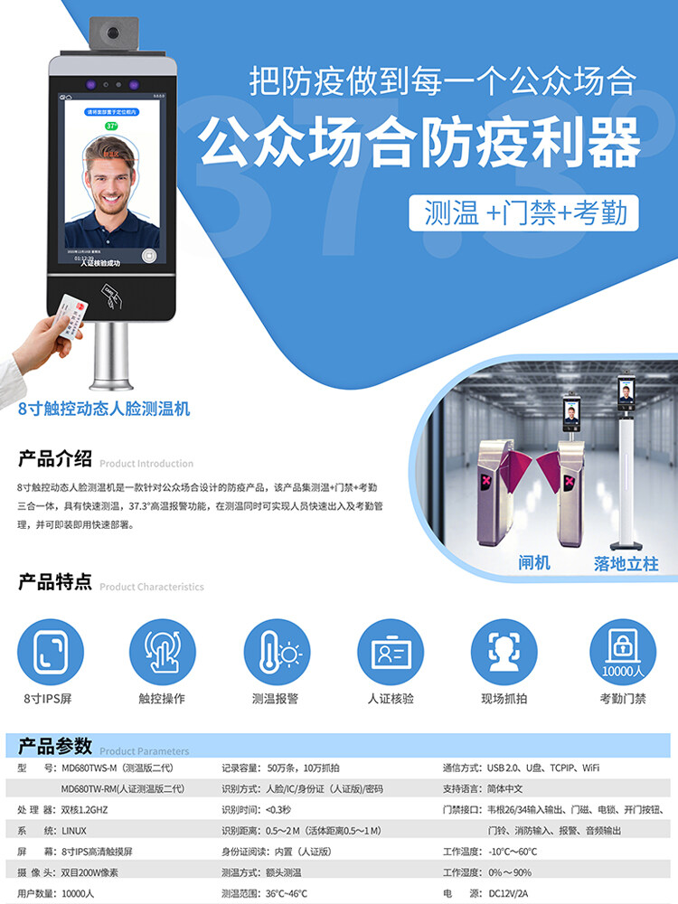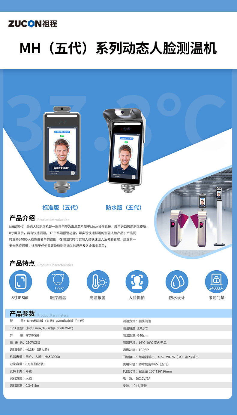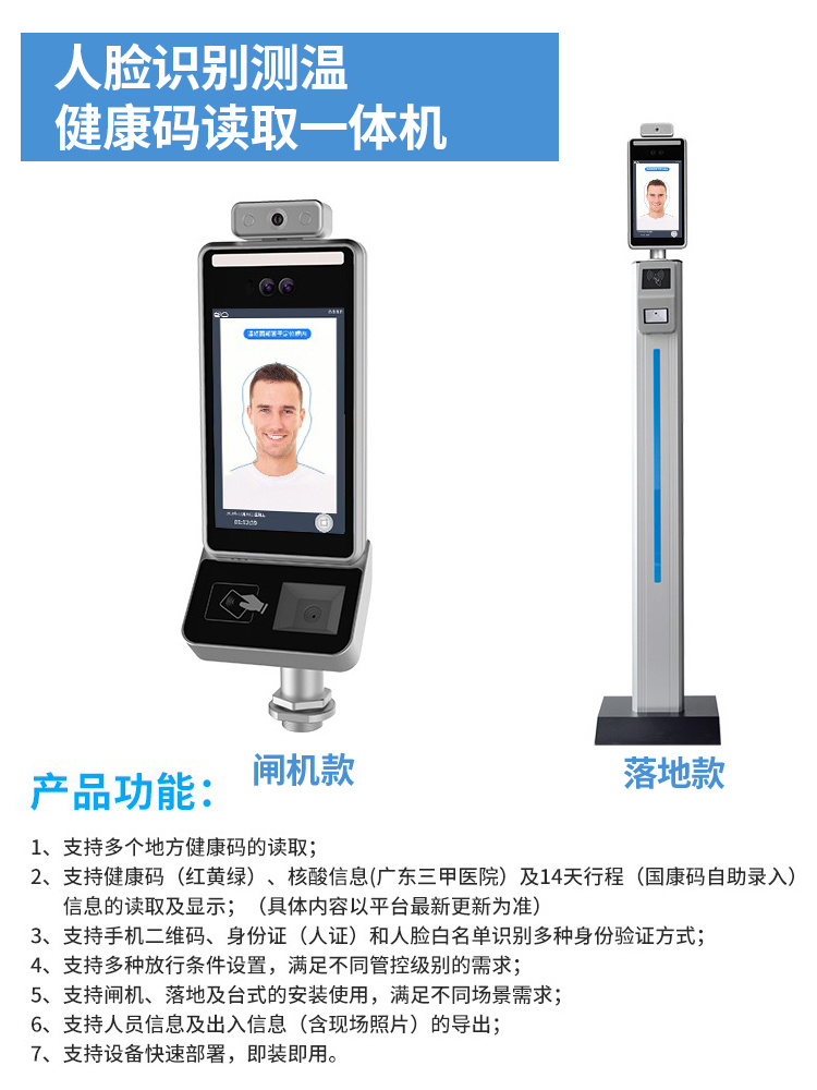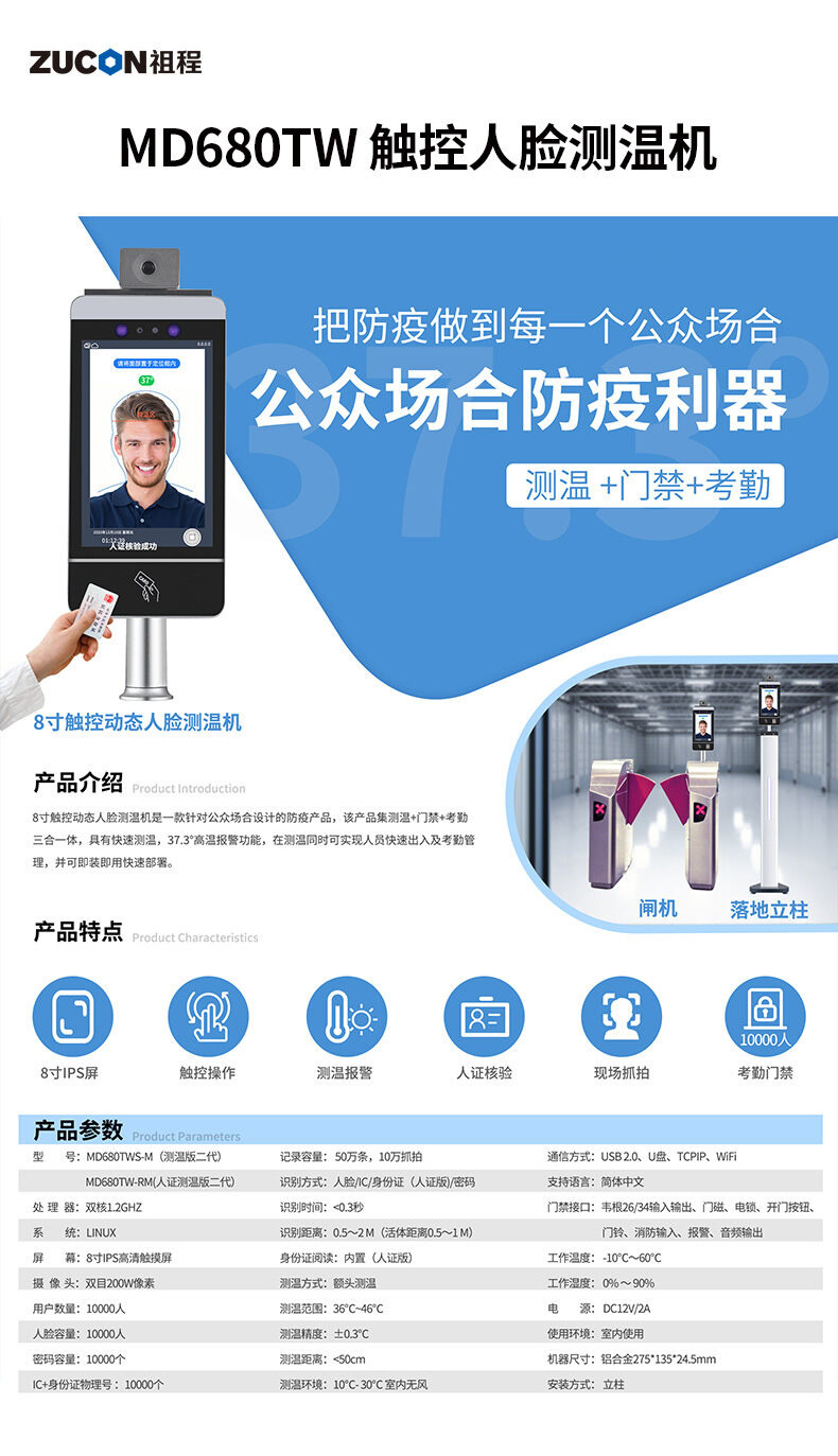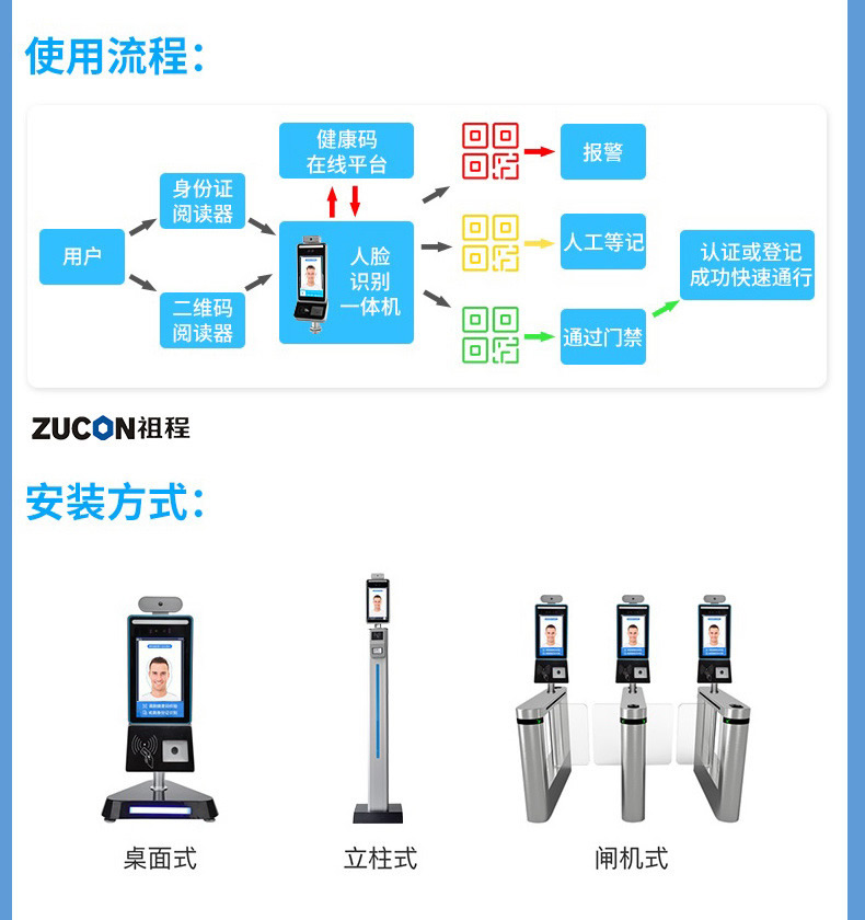 ZUCON人臉識別測溫健康碼證件讀取一體機 通道閘機系統防疫管理