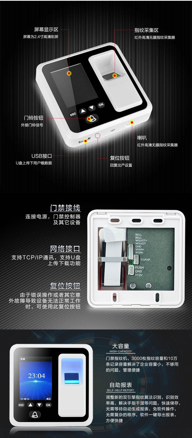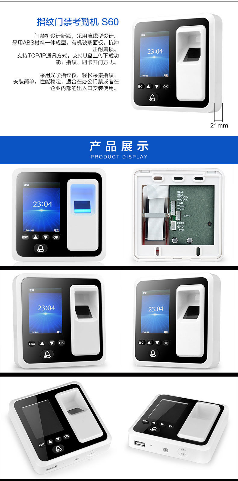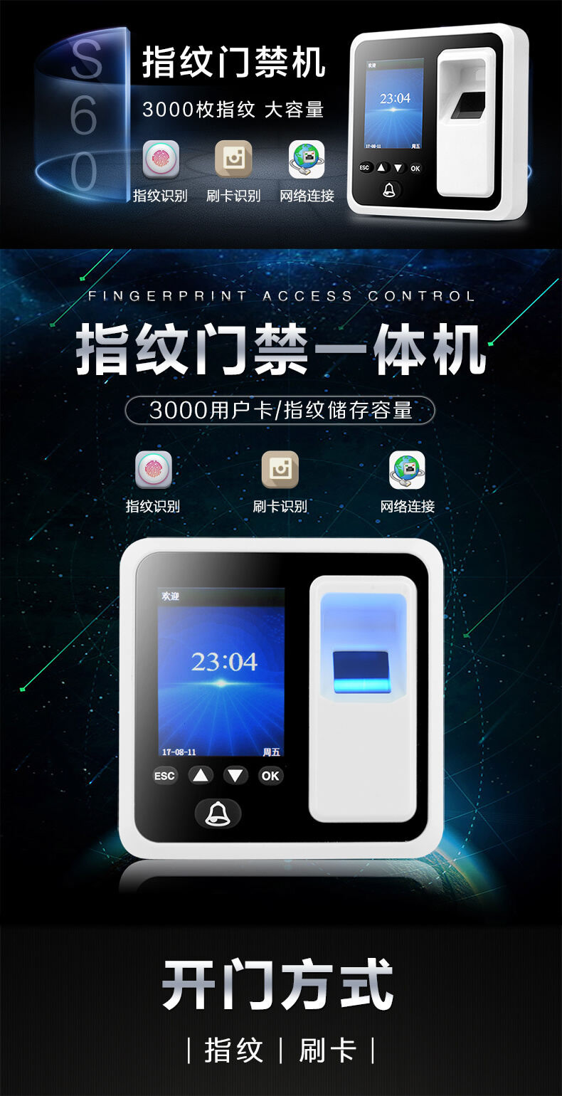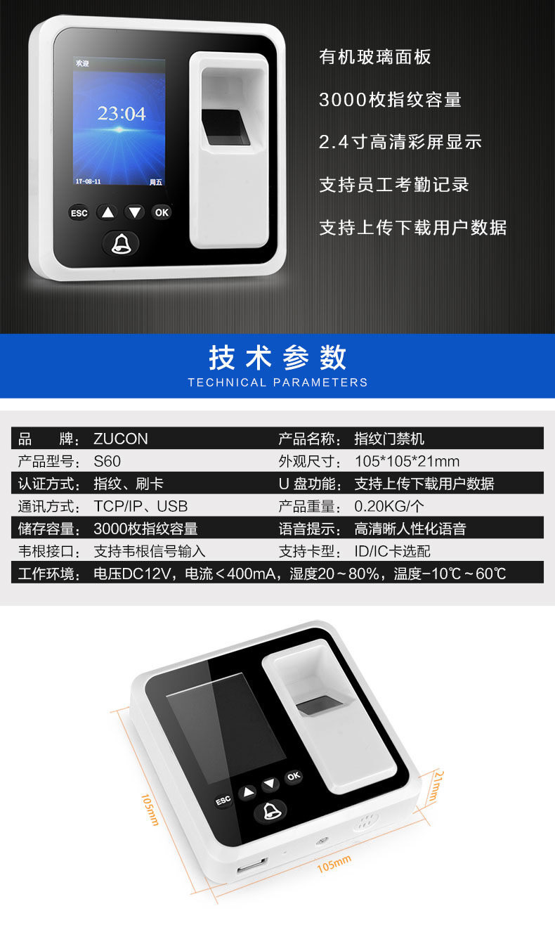 ZUCON祖程S60指紋 刷卡門禁考勤主機 網絡U盤下載數據 3000大容量