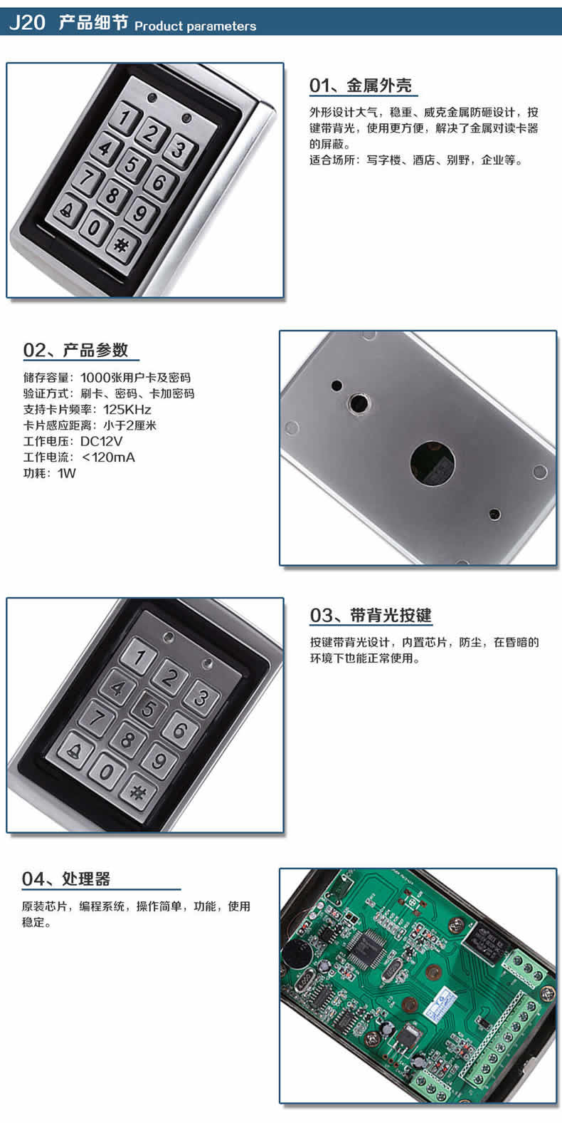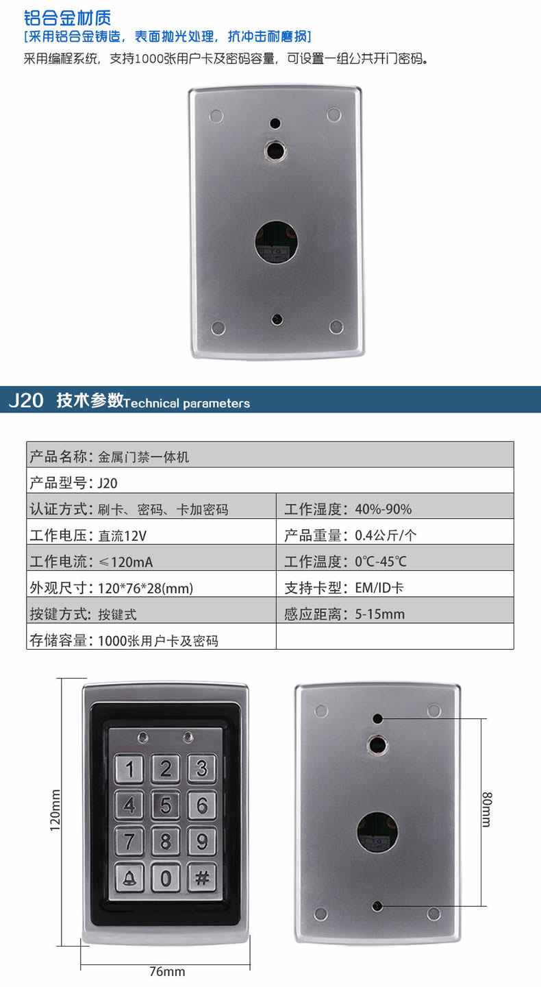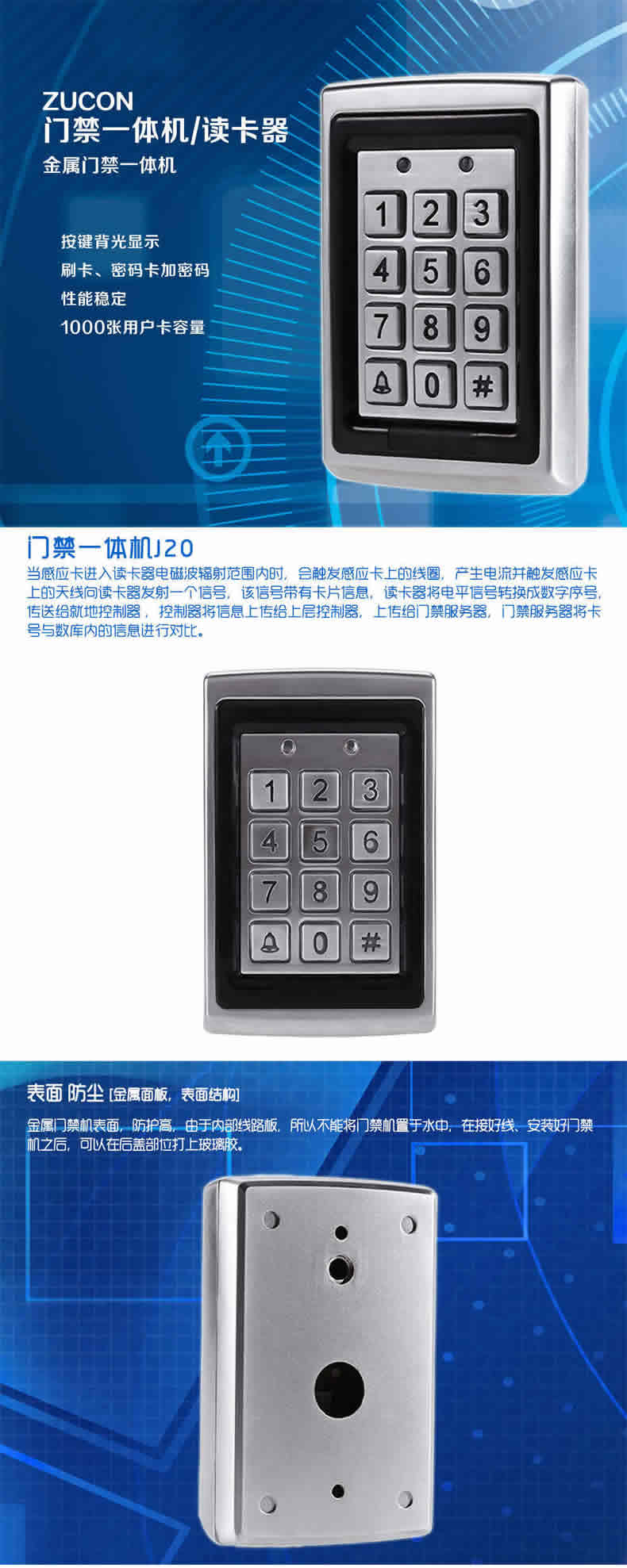 ZUCON祖程J20 金屬防水門禁機ID刷卡門禁一體機 金屬刷卡機 背光鍵盤